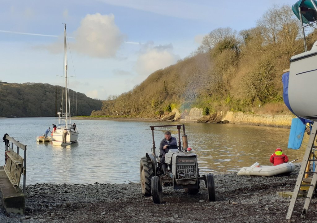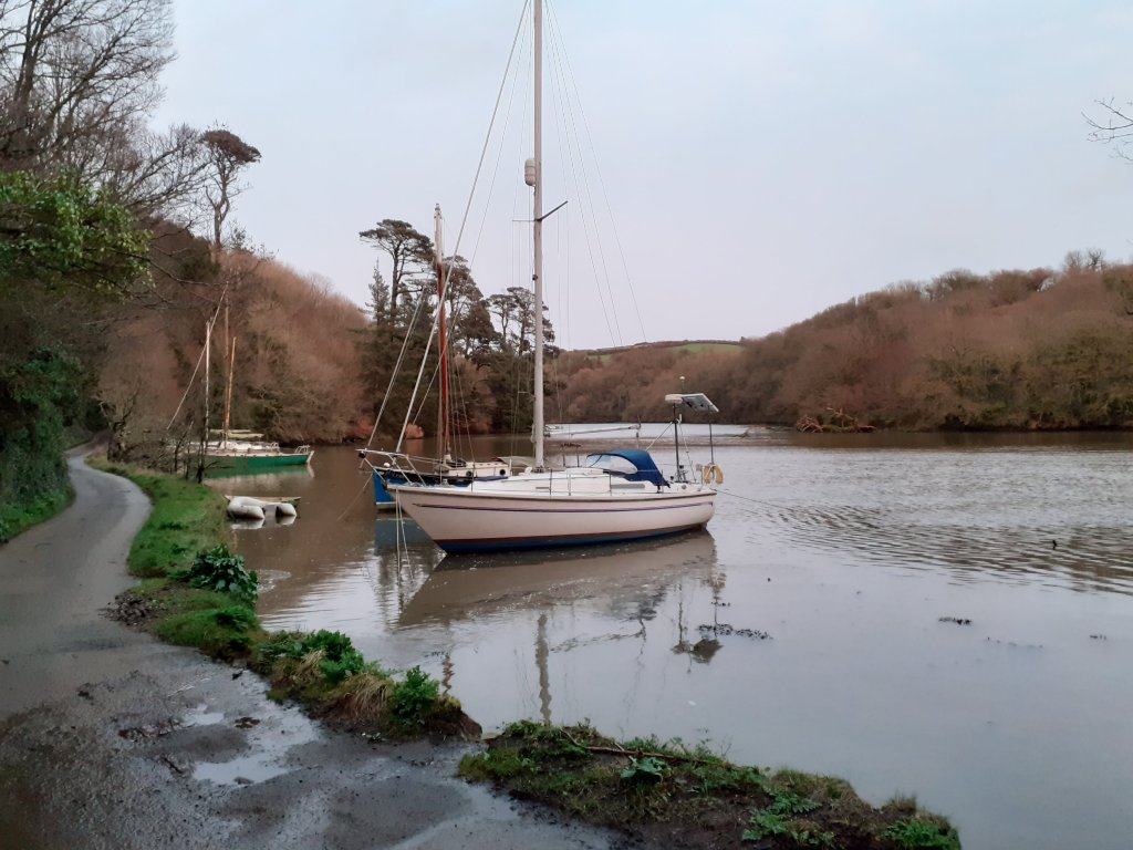 The tide was a problem, not really high enough to float Elektra and get her down the channel to the boat yard just 1/2 mile away. I had hoped to float her on the evening of 24th February but she didn’t float at high water, which meant getting out early before light on the 25th which worked and I was able to pull her into deeper water ready for her move to St Anthony the following morning.
