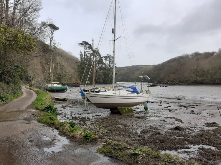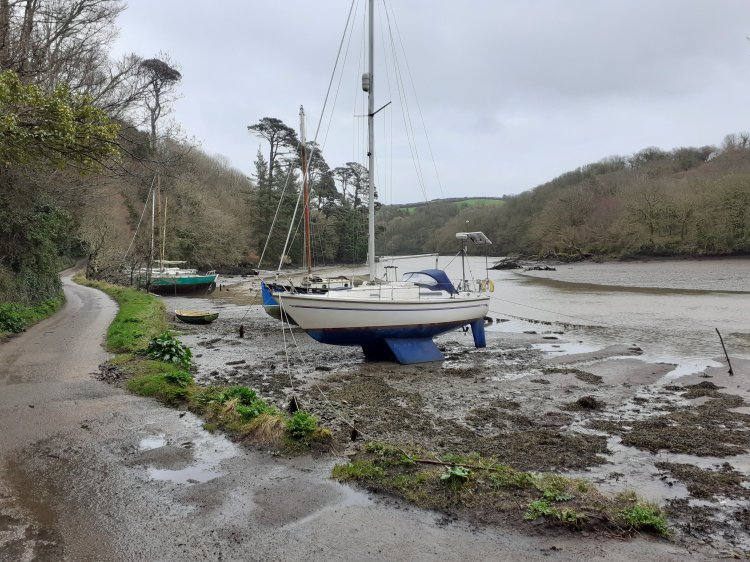 Still raining but an ideal cleaning day l started with the top sides while the tide was going out. Once she had dried out l started scrubbing under the her water line, not a great job lying on the muddy creek bottom!