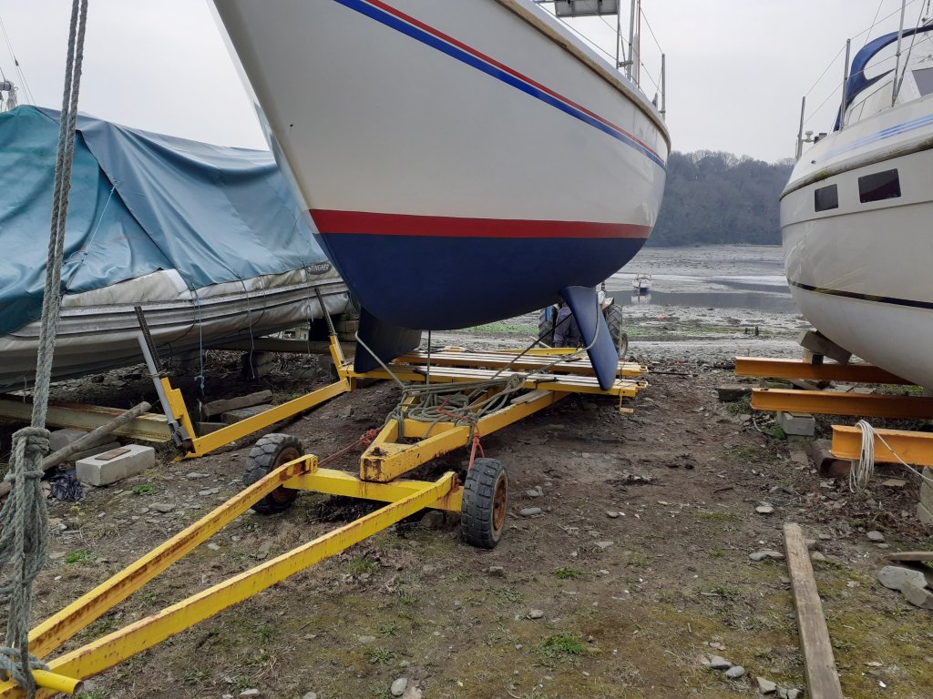 The first thing they need to do is lift the yacht and slide the trailer in under, chatting with the yard guys they were telling me as Elektra was the first going in, all the stuff needed had to be found from where it had been stored in the winter. Almost 2.5 days later Elektra was ready to pull down the beach to float off on the next tide, I was thinking around 1700hrs. Now 1300hrs I headed home (2 miles) for lunch and to agree a time for Vicki to come help with launch. In the afternoon, I went back to see how things were going.