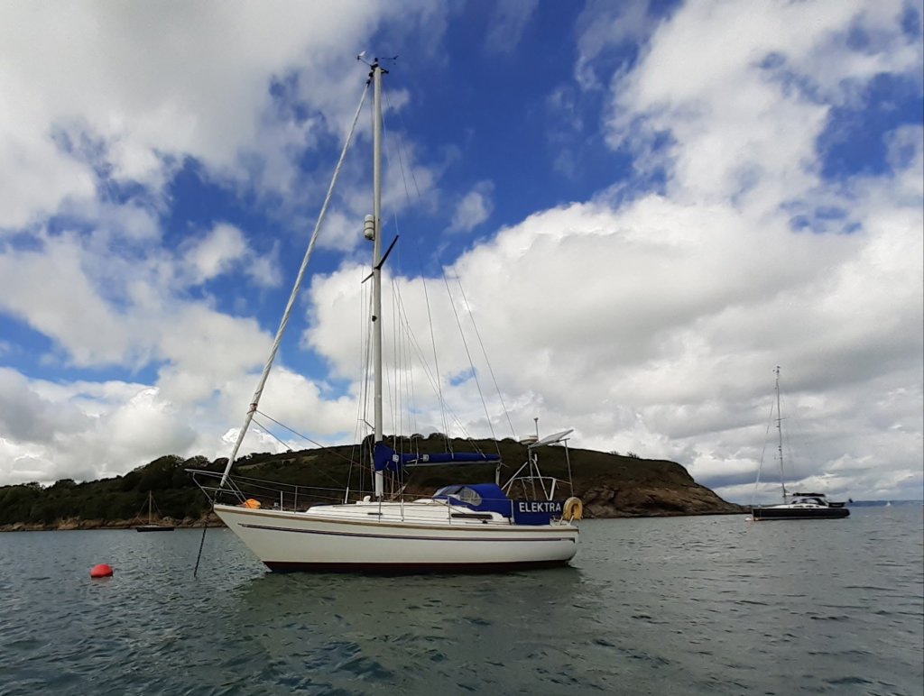 Elektra had been in the water since the end of March but we had only used her seasonal mooring for 4 days due to easterly winds. We had been away for a few days but needed to get back in order to get her onto her gale proof mooring before the next blow. The easterly lasted until the end of Monday and it was Thursday before l had time to move her out onto her seasonal mooring again.