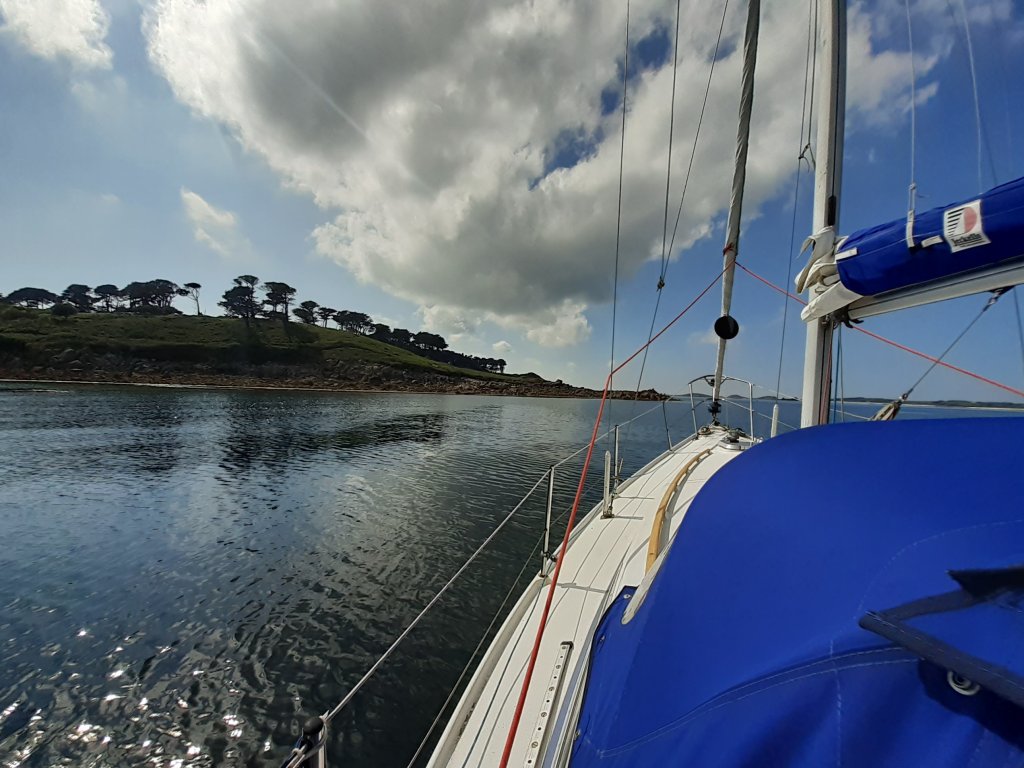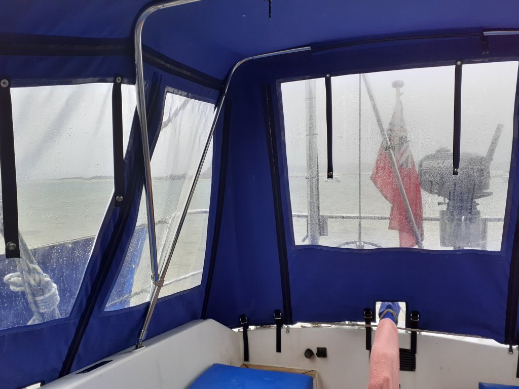 After arrival in Scilly on Saturday evening we had sunshine but we knew the forecast for Sunday was poor so we put up Elektra’s cockpit enclosure. The forecast l had seen was for force 4 gusting 6 with rain but l gathered later that the met Office increased the the wind forecast last minute.