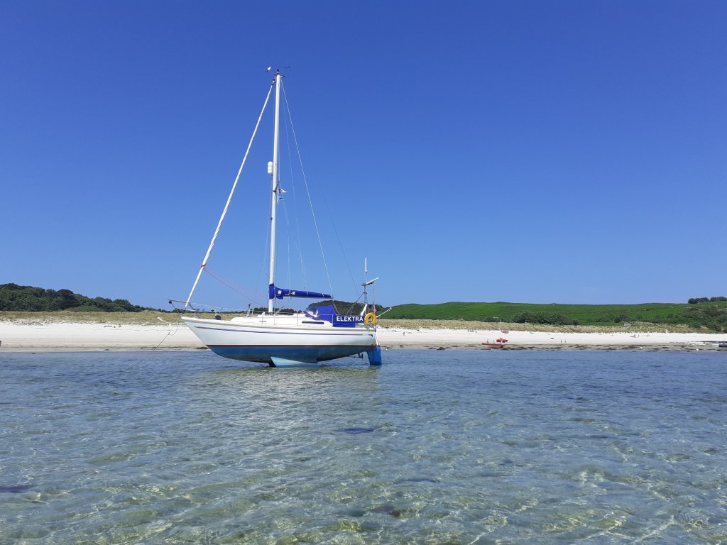On Monday evening after the tide had floated Elektra again we motored her out of East Porth northwest though St Helen’s Pool out around the north of Tresco into New Grimsby Sound. The sea north of Tresco was still quite big and confused but once we made the turn into New Grimsby the sea soon settled down. We passed the moored and anchored yachts in the Sound and turned into Green Bay off Bryher. Still on a rising tide we gingerly moved in watching the depth sounder. 2.6m quickly changed to 1.6m at which point l did a U turn and went forward to drop anchor. As per normal Vicki had problem in reverse, l suggested just let her lie back in the wind, when Elektra straightens up, l will dig the anchor in.
