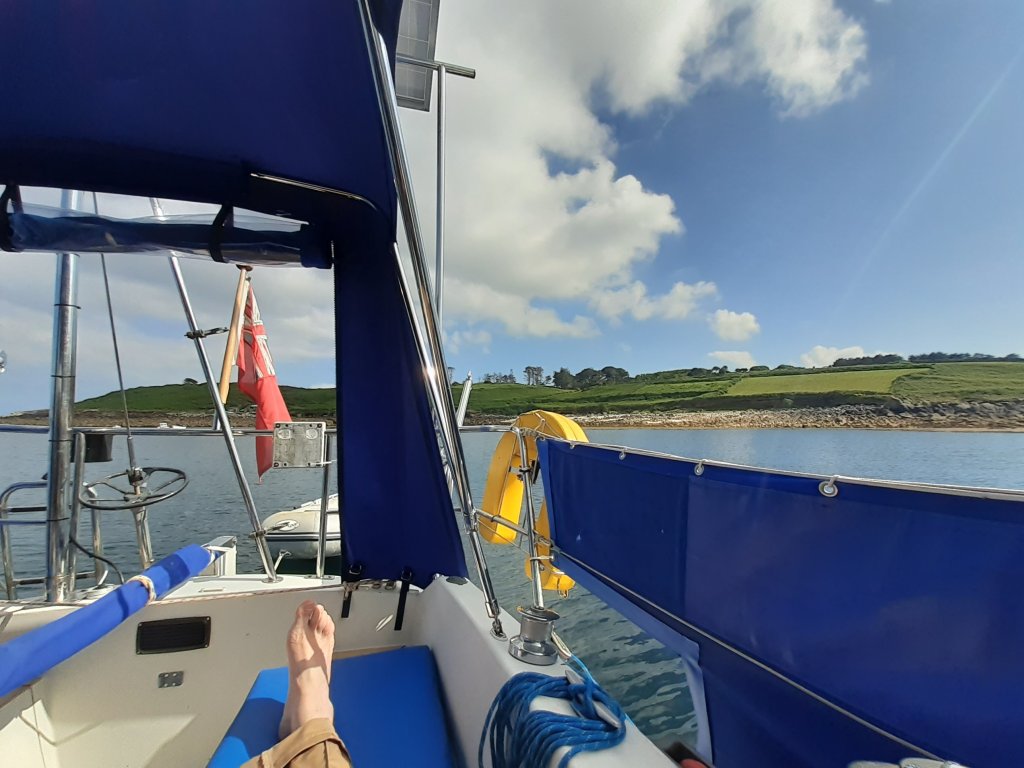 A lazy walk back to the punt, we sat there for a while enjoying the view. Then l pulled the punt back to the water and we motored out to Elektra. She still had over 1m under the keel so we then decided to move Elektra to Watermill Cove before the tide went out. We decided not to remove her cockpit enclosure and gently motored her west then south to the cove.