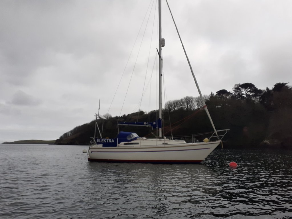 Out the next morning at 0500hrs to catch the tide, l pulled up the main and dropped mooring at 0545hrs as planned and motorsailed across Falmouth Bay towards Fowey in light Northeast wind. I soon went down to get the tiller pilot to take over. Then followed a quite fast passage motorsail passage to Fowey arriving about 4hrs later having logged 23nm. In Fowey you wouldn’t have thought we were an early yacht, the pontoon was already full so we rafted to “Rockhopper” a Sadler 32. Being still quite early, Vicki cooked brunch before we rested. With a pontoon party early evening and run ashore for an evening meal, the day seemed to fly by.