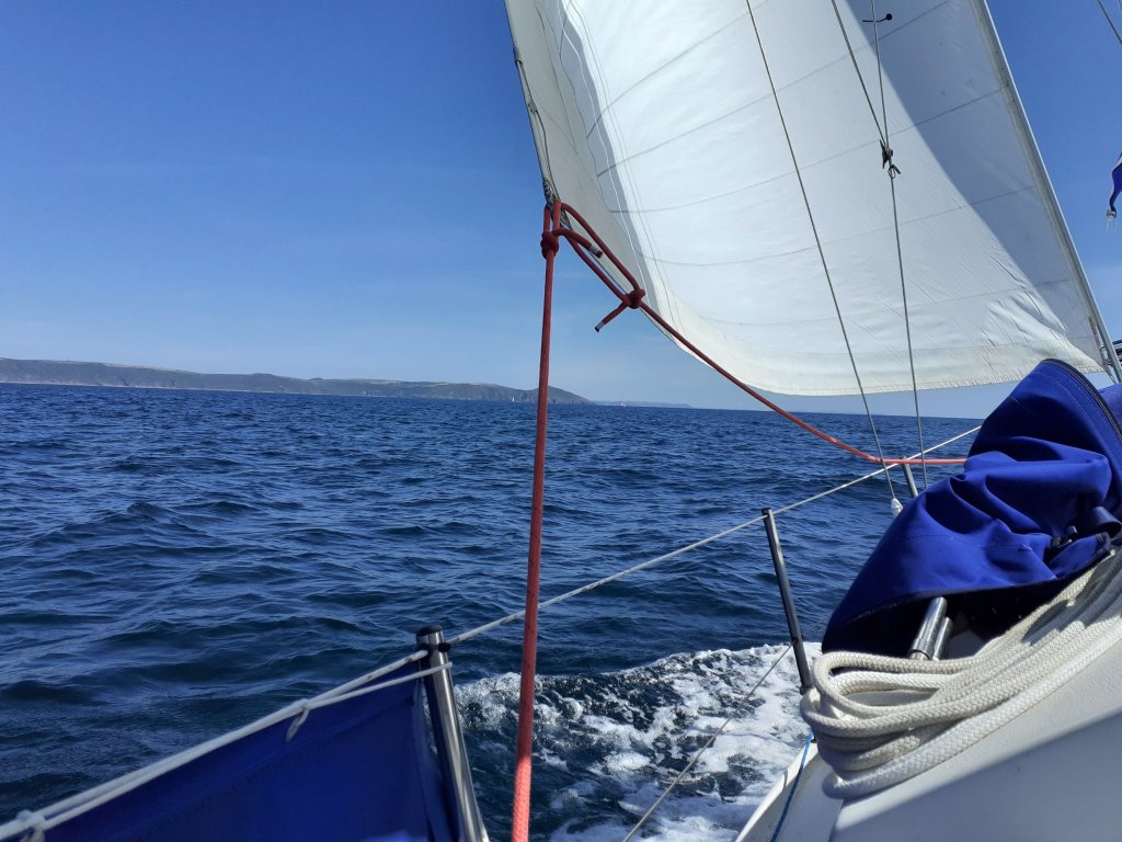 It seemed an earlier start would be a good idea, l pulled up the anchor and Vicki motored Elektra out of Polgwyn Cove at 0930hrs. Once clear of the shelter I set all the sail and stopped engine, there didn’t seem much wind at all and it wasn’t long before we were motoring again! Around 1000hrs off Fowey the wind filled in a bit and we could sail east-northeasterly towards Udder Rock. After almost an hour of slow 3kts of sailing we started motoring again along the coast north of Udder Rock, passing Polperro and then Looe Island.