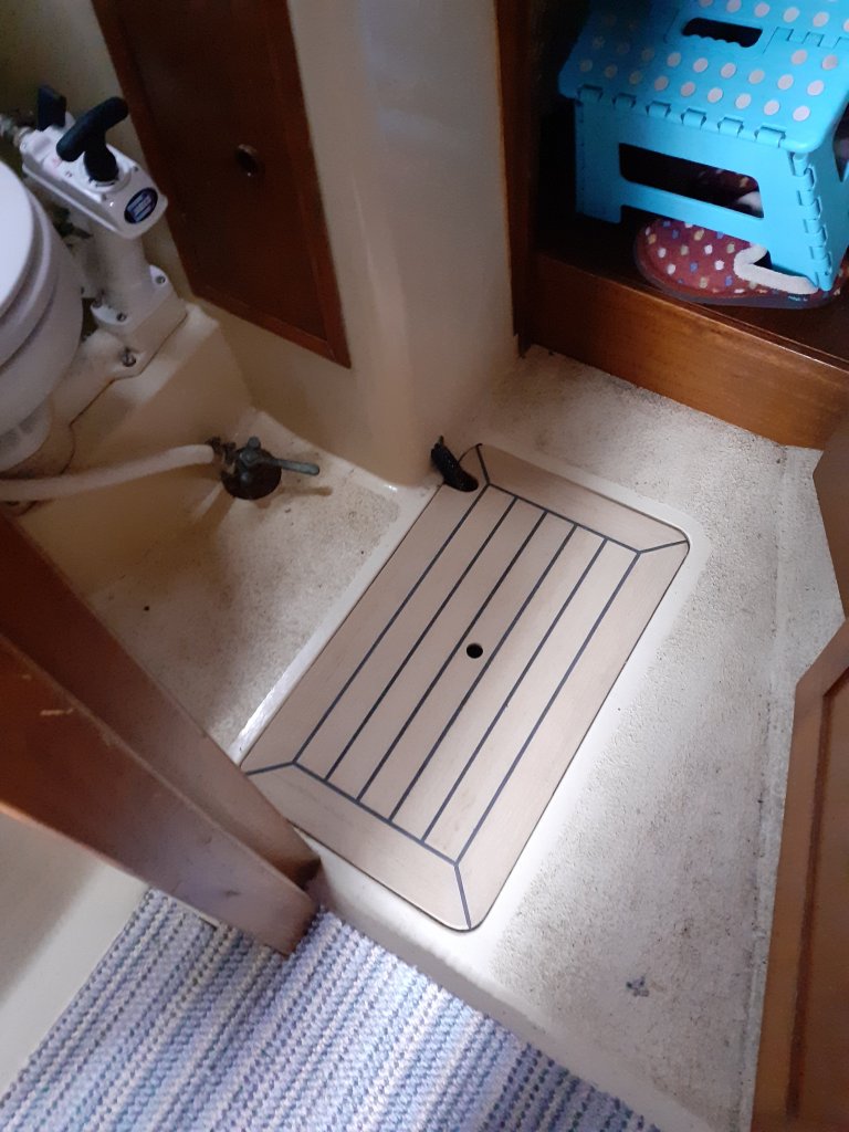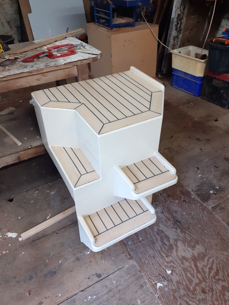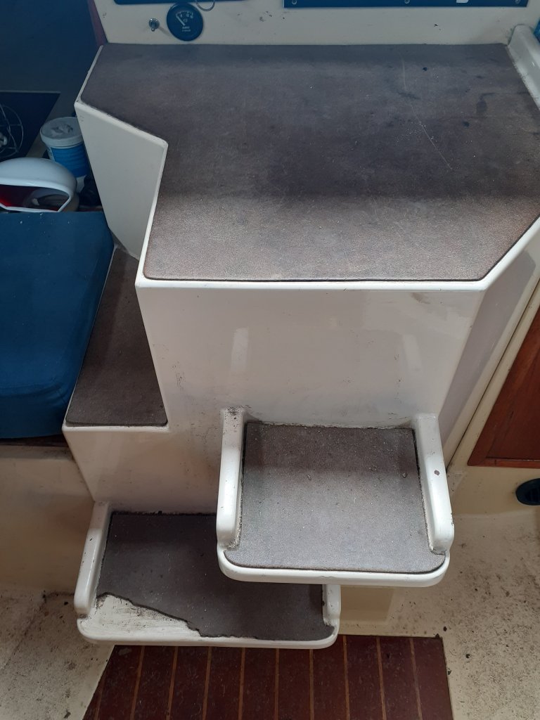 Back at the end of the winter, l had ordered new Flexiteek panels for the companion way steps, galley and heads floors. The panels had arrived just before our holiday. Another job was to fit them, we also decided a saloon carpet would be nice. And I had some external GRP repairs, so l had quite a list to be going on with. I started with the swapping off of the old step grip surface.