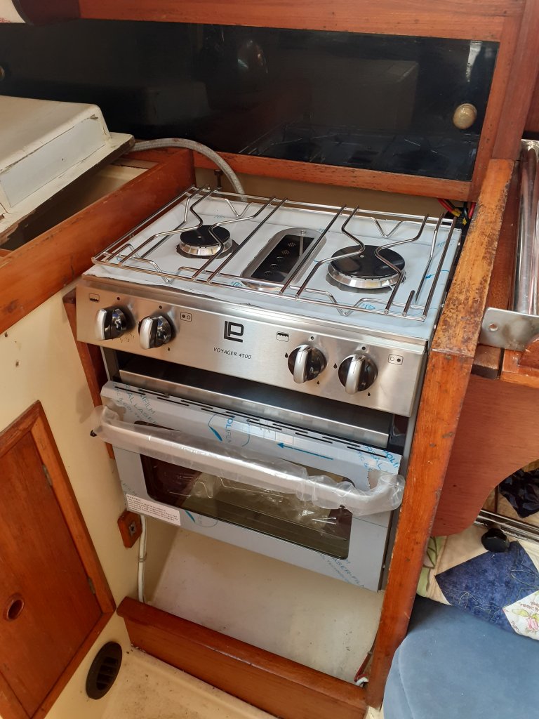 Then it was the turn of the cooker, now the cooker wasn’t heavy but it was bulky and l wasn’t sure enough of myself to get it aboard Elektra on my own, so l asked the help of my friend Tony and between us we managed it easily. Fitting it was a little easier except l found l needed the compression fitting from 8mm cooker to 6mm gas pipe which l needed to order from the Internet. So fitting cooker was put on hold.