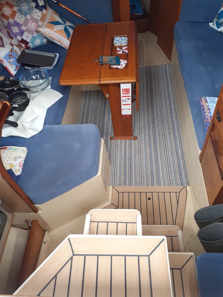 Back to the workshop and get on with the other floor panels and better raised cockpit seating. I had bought clear epoxy coating for the underside of floor panels and the cockpit seating. I hadn’t ever used epoxy, so it was a learning experience for me. The speed of the process impressed me, l had only ever used varnish in the past. Having done 3 coats the next day l was sticking on the panels. Using a offcut from our dining room carpet l cut a piece for Elektra’s saloon. I think the end result is very nice.