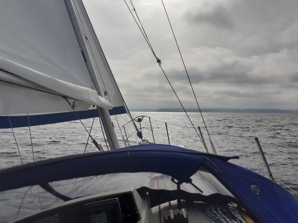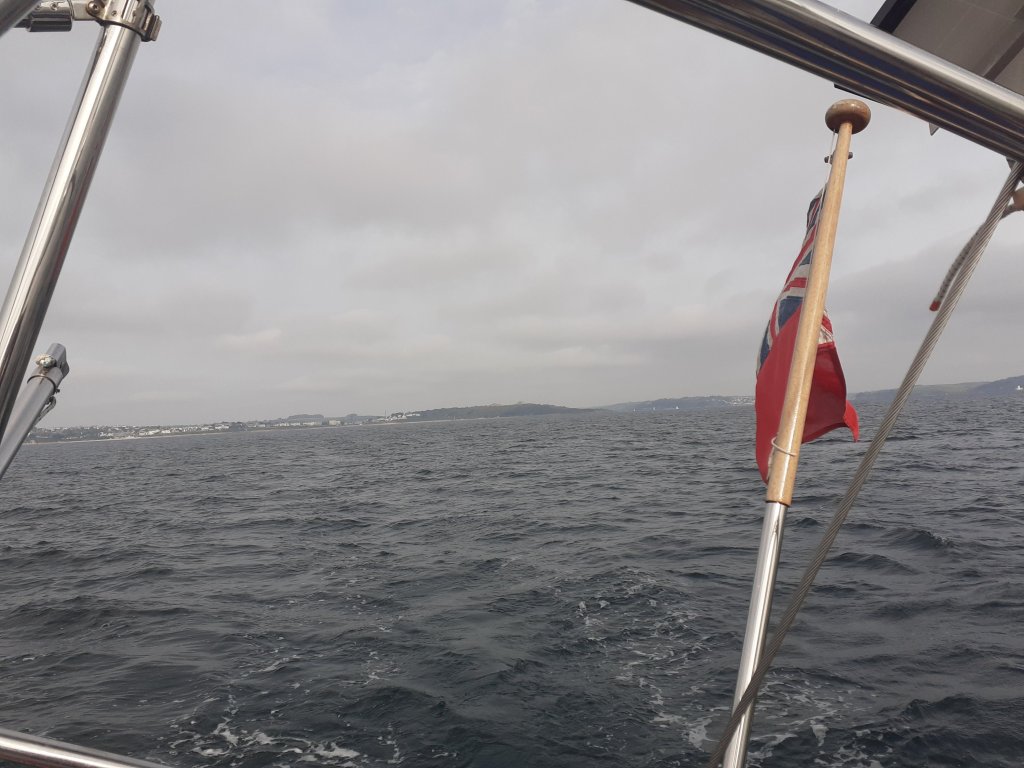 I went out on Tuesday 10th of October, I was keen to get over this hurdle and pull up the mainsail but in the end chickened out. I dropped the mooring at 1105hrs with a forecast of SW force 2-3/ force 3-4 later, motored out of Gillan and set just the genoa, sailing east to round the Nare Point and southeast towards Manacle Buoy. With stronger wind of the point Elektra slowed again once rounded. I decided a bit of mainsail would be better. So pulled up the main with one reef, already the tiller pilot wasn’t copping well but once the sail was set I could take over the helm and steer a better course. Elektra was going well between 5-6kts SOG against the neep tide, when we passed the Manacle Buoy at 1200hrs having logged 4nm the sea started getting very lumpy with spray coming over and I wasn’t wearing any waterproofs.