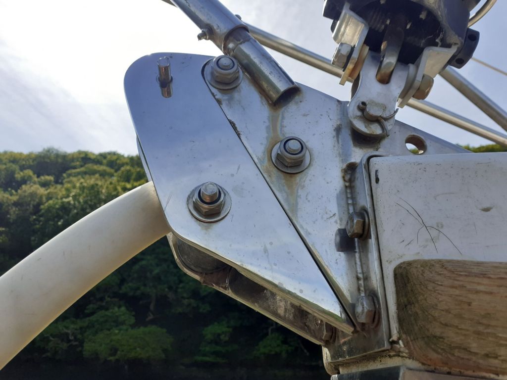 After our plans to go to Scilly were aborted because of a bad forecast, we had come back from a weekend away and moored Elektra on her gale/east wind trot mooring in Carne Creek. The forecast turned out to be wrong, there had only been one windy wet day not the three-to four days. But we still couldn’t go sailing because Elektra was neeped until Saturday. On Friday I used the day to try and seal up a leak we still had from a U bolt fitting on the side deck, I had resealed both port and starboard fitting during the winter but only the starboard U bolt sealed.