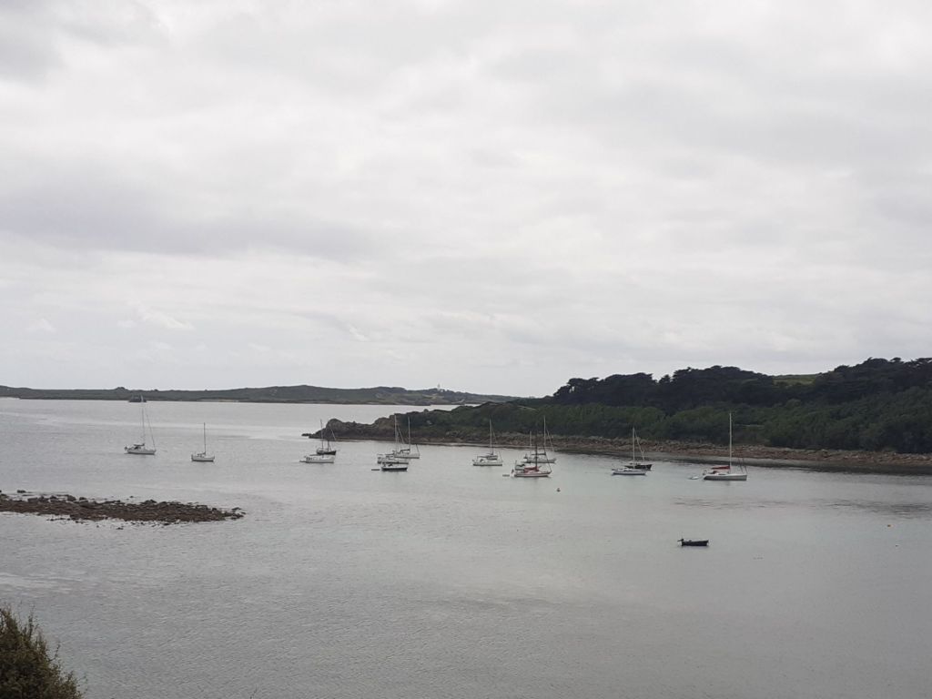 On Sunday we planned to move to Porth Cressa as we were leaving Scilly at low water on Monday so needed a deep water anchorage with easy exit to the sea. We hadn’t ever been in Porth Cressa even though we had visited Scilly now 8 times. So it was out with the pilot book and reading about the Wras and the Biggal. After breakfast, l was doing the washing up, the sun was out and blue skies, so l took a picture though the cabin window so l did miss the best part of the day!
