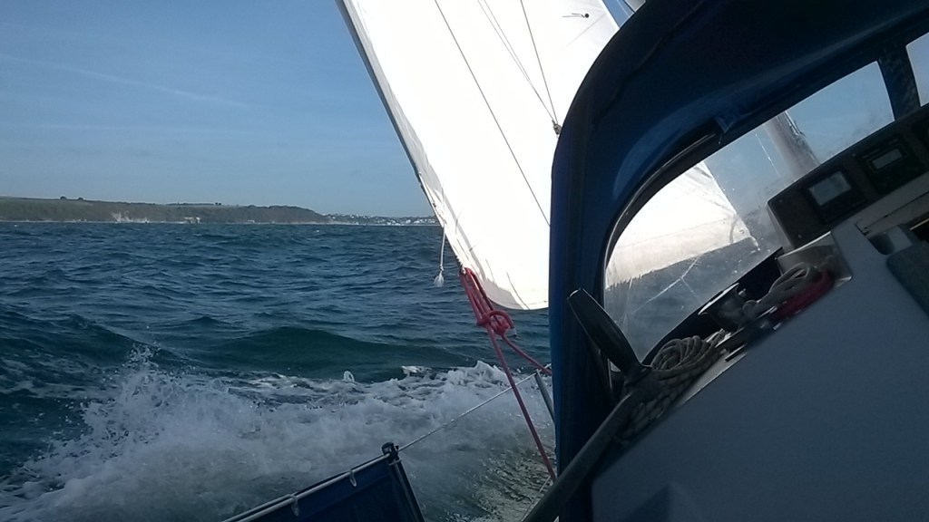 The tide was with us 0800-1400hrs and with the wind forecasted to increase from westerly force 4 to southwest force 5-6 by the end of the day we didn’t want to hang around so we cast off at 0700hrs. We motored Elektra out of Fowey and towards Udder way point setting all the genoa on route. From Udder cardinal buoy (3.5nm from Fowey) we turned the engine off and sailed. Again Elektra was logging 5-6kts in moderate sea and about 8nm of visibility.