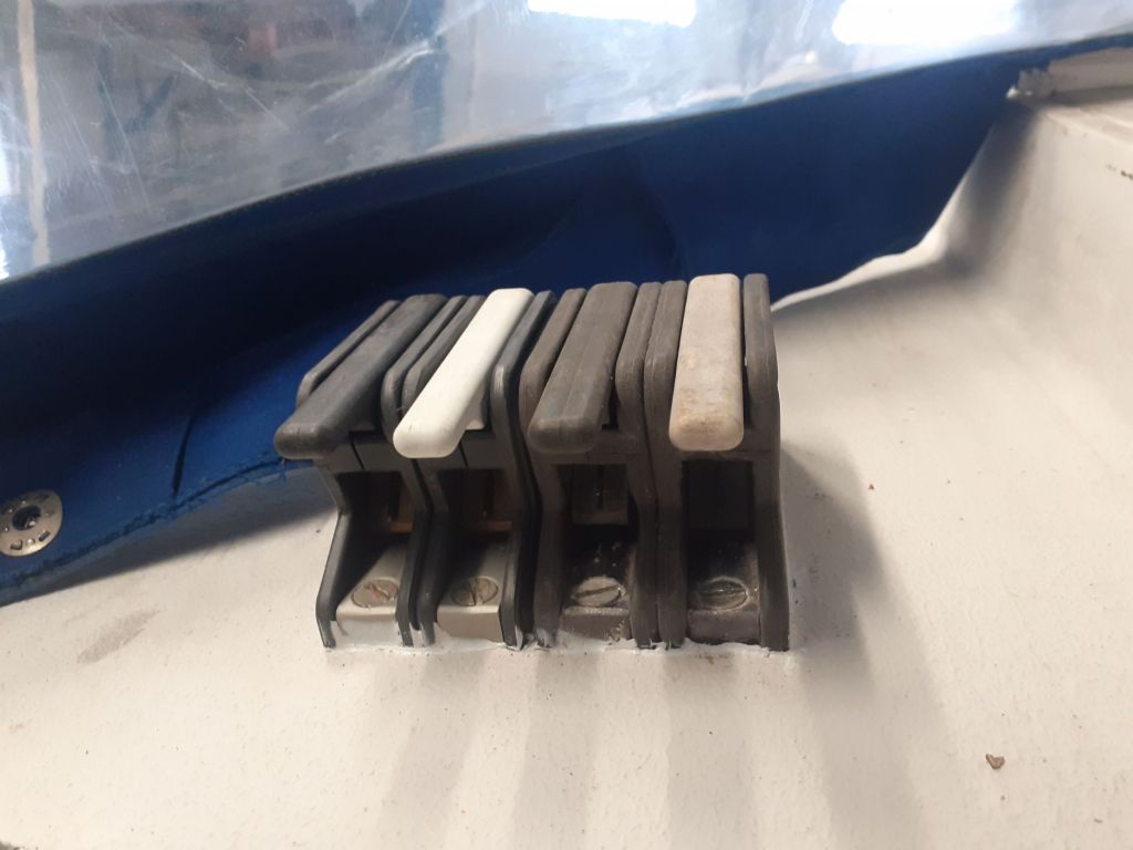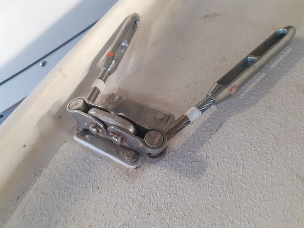 Within a week of being pulled out of the water on the 24th, her mast had been crained off and Elektra was stored indoors for the yard to get on with the work. I spent my spare time rebedding the chain plates, deck organiser sleeves and fitting the new deck clutches
