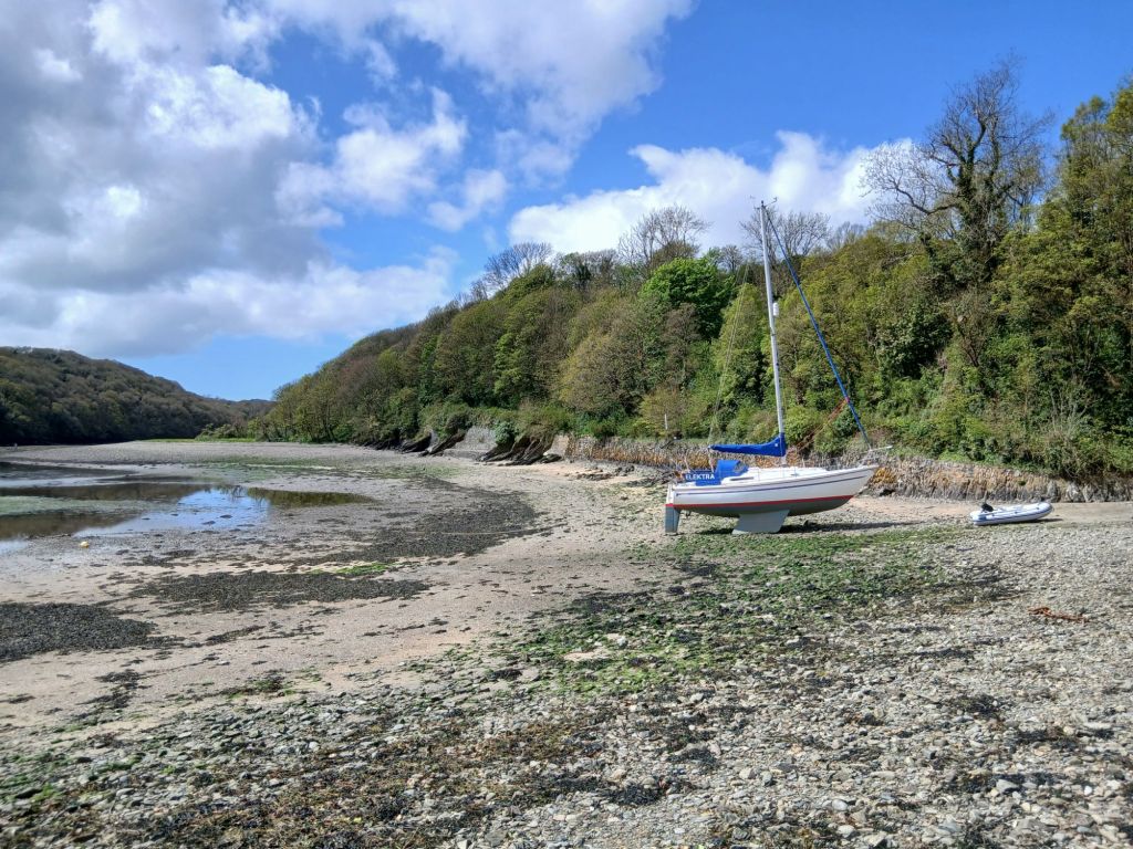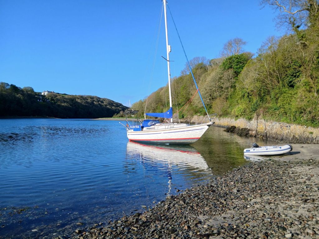 Once into Gillan Harbour, it was too early to dry Elektra out on St Anthony beach. So l motored her on out into Helford River entrance to check engine and instruments, an hour or so later motored her back into the Harbour and slowly eased her speed to almost 0, so her keels slowly grounded on St Anthony beach, the putting the engine forward again to hold her there. When she stopped rocking, l stopped her engine. Locking up the cabin and climbed out into the dinghy and to the shore and pulled up.