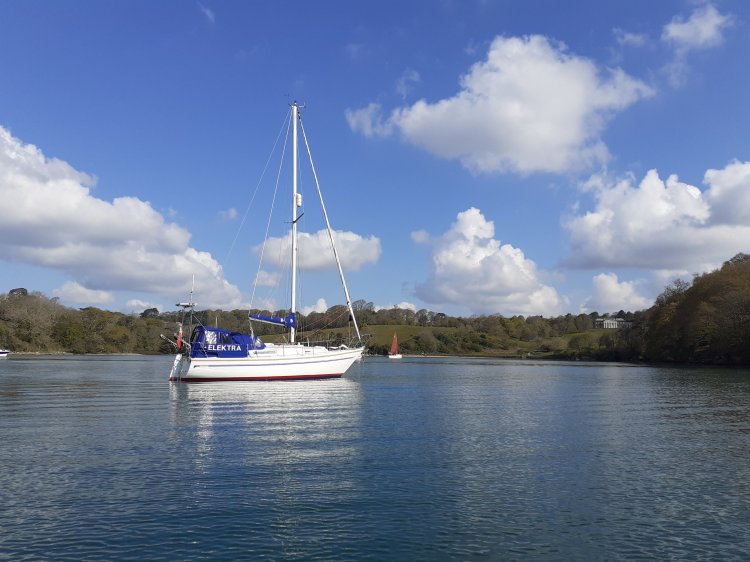 Around midday we were ready, we needed to leave St Anthony beach before 1400hrs. Out at Elektra again the temperature was rising, we stowed the gear and stores and then sat in the cockpit eating the takeaway looking out at Falmouth Bay like a mill pond. It looked like we would have to motor and after motoring to and from Scilly we didn’t fancy it. So we stayed on the mooring and enjoyed the surroundings. In the evening we motored into Flushing Cove for a quieter night
