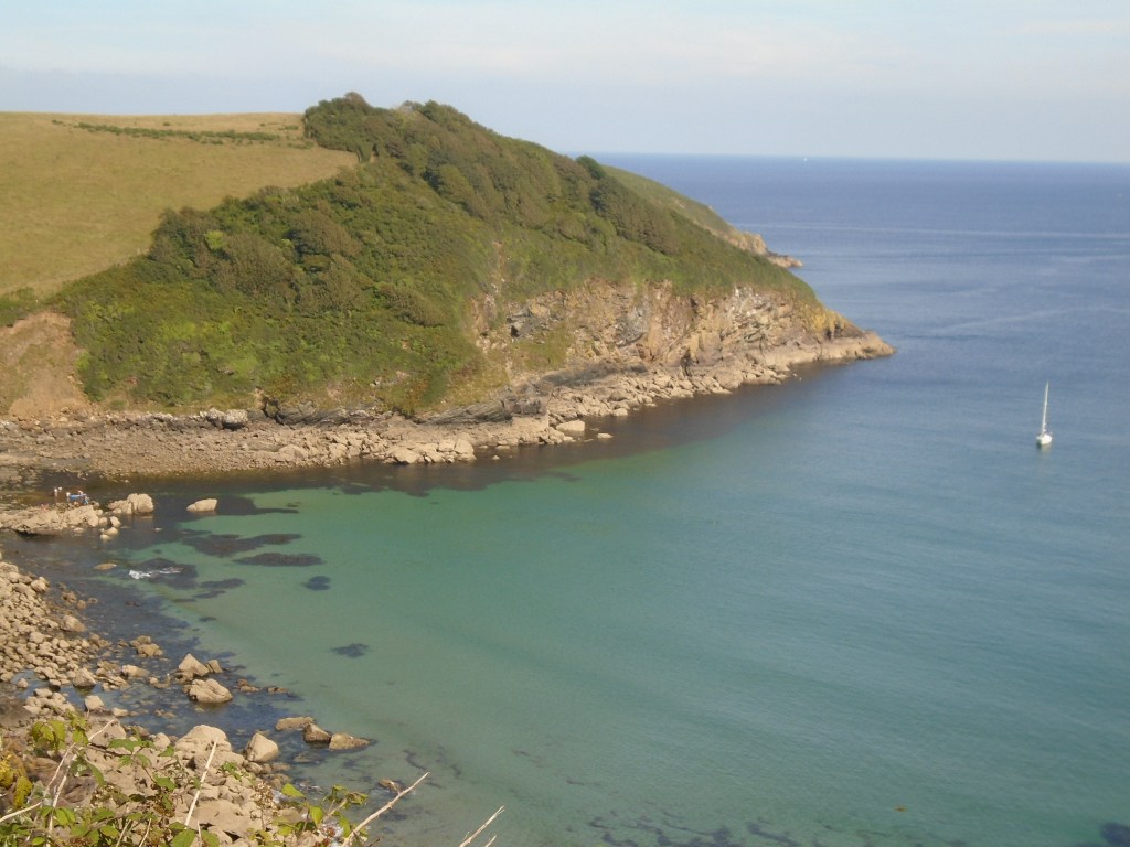 It was time to head back, the forecast was for NNW force 4 today but dropping very little wind on Tuesday. The tide wasnt with us until 1330hrs so there was no hurry to get going so after a lazy brunch we lifted our anchor at 1310hrs and motored out of the cove, set all the sail and goose winged our way south across Mevagissey Bay until the wind died away off Chaple Point and I started the engine again. We motored from there and around the Dodman Pt before the wind filled in again and we could sail.