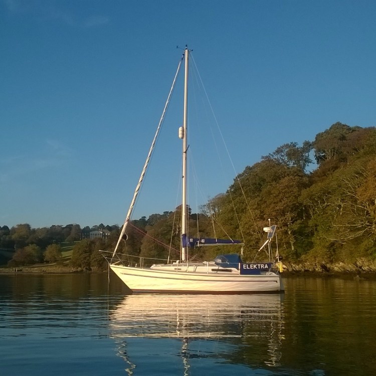 At 1350hrs we droped the mooring and sailed out of Gillan with a forecast of NNW4-5, slowly at first but once out of the shelter of the Dennis Head into the Helford River the wind got us moving. We were close on the wind but we had a good line for Pendennis Point with reefed main and reefed genoa Elektra was making between 5-6kts SOG into a NW5. Our first tack came just south of the southly cardinal buoy of St Mawes having logged having logged 5.5nm in an hour and 5mins. The starboard tack took us over to Falmouth Harbour before we tacked again heading for St Just in Roseland. Tacking again this time heading just north of the Mylor moorings into shallow water. I knew we were pushing it just after low water there wasnt going to be much depth but the sailing was good. Logging over 5kts our least depth was 0.2m under the keel, but all adds to the joy of sailing. Our next tack took us over just south of Turnaware Buoy, I wasnt going to risk going over the bar so we I started the engine and furred the sails before motoring into Channels Creek and dropping anchor at 1620hrs having logged 11.5nm. we had only been there about an hour and the wind dropped of to a flat calm.