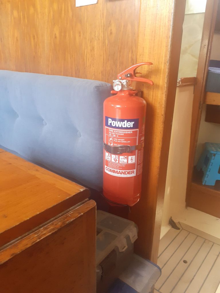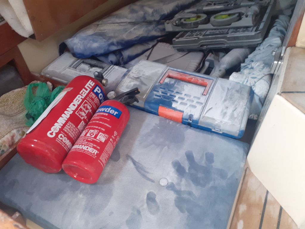 Fire extinguishers, when it comes to fighting a fire, simple is best! During the winter I had bought a fire stick, I read the instructions and put it on its braket, but when the fire started I couldn’t remember how it worked and for some reason I had forgotten how to read! The 1kg powder extingisher was dead simple, pull the safety clip and press the leaver. So simple is best. If you don’t know, or any of your crew don’t know how to opperate any safety equipment before you grap it, it’s useless to you! Reading the instructions on the fire stick again after the fire, I know just how it operates now. But this wouldn’t have helped much with this fire as it works for 50 seconds and then stops. With the powder, I was blasting it with powder, putting the fire out and stopping, then the fire would start again and so on, possibly for as long as 1/2hr! Powder extinguishers are horible to use and horible to clear up after a fire, but are very efective, by the end of the first week I had already replaced the used ones plus added another 2kg one.